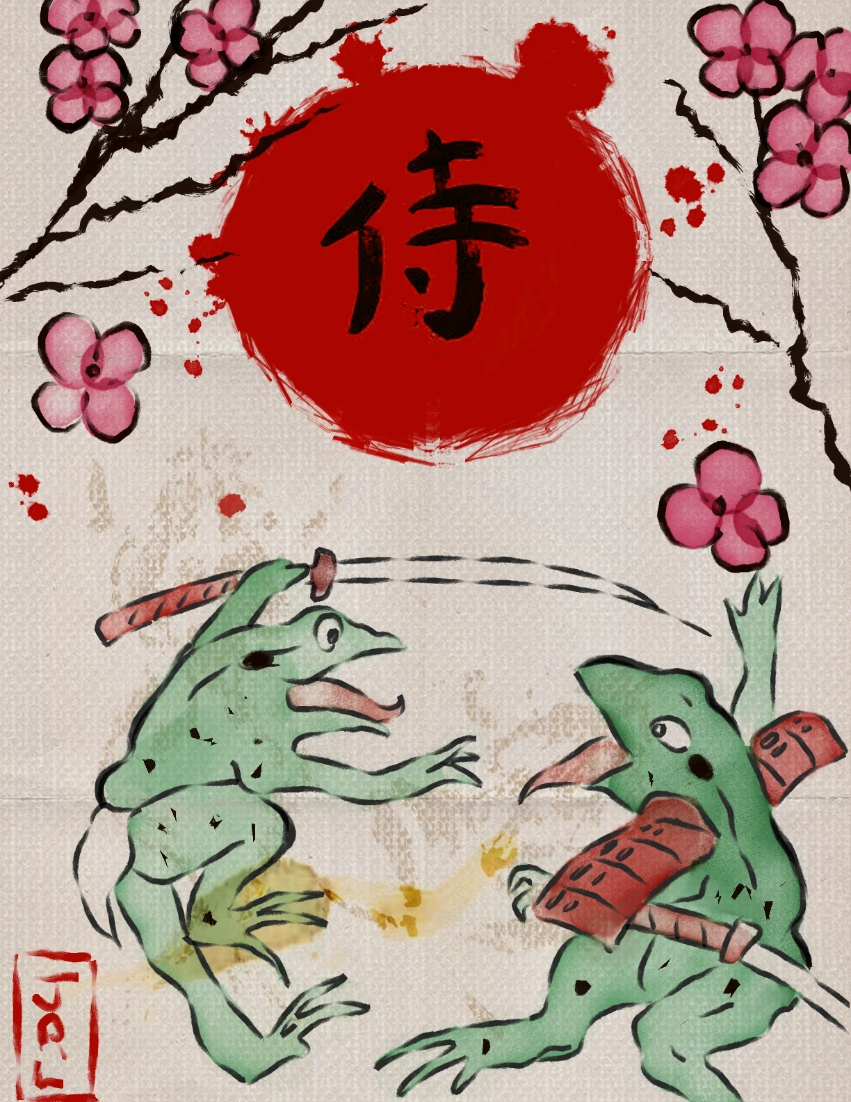 Fun mixed media illustration of dueling Sumi-e samurai frogs.